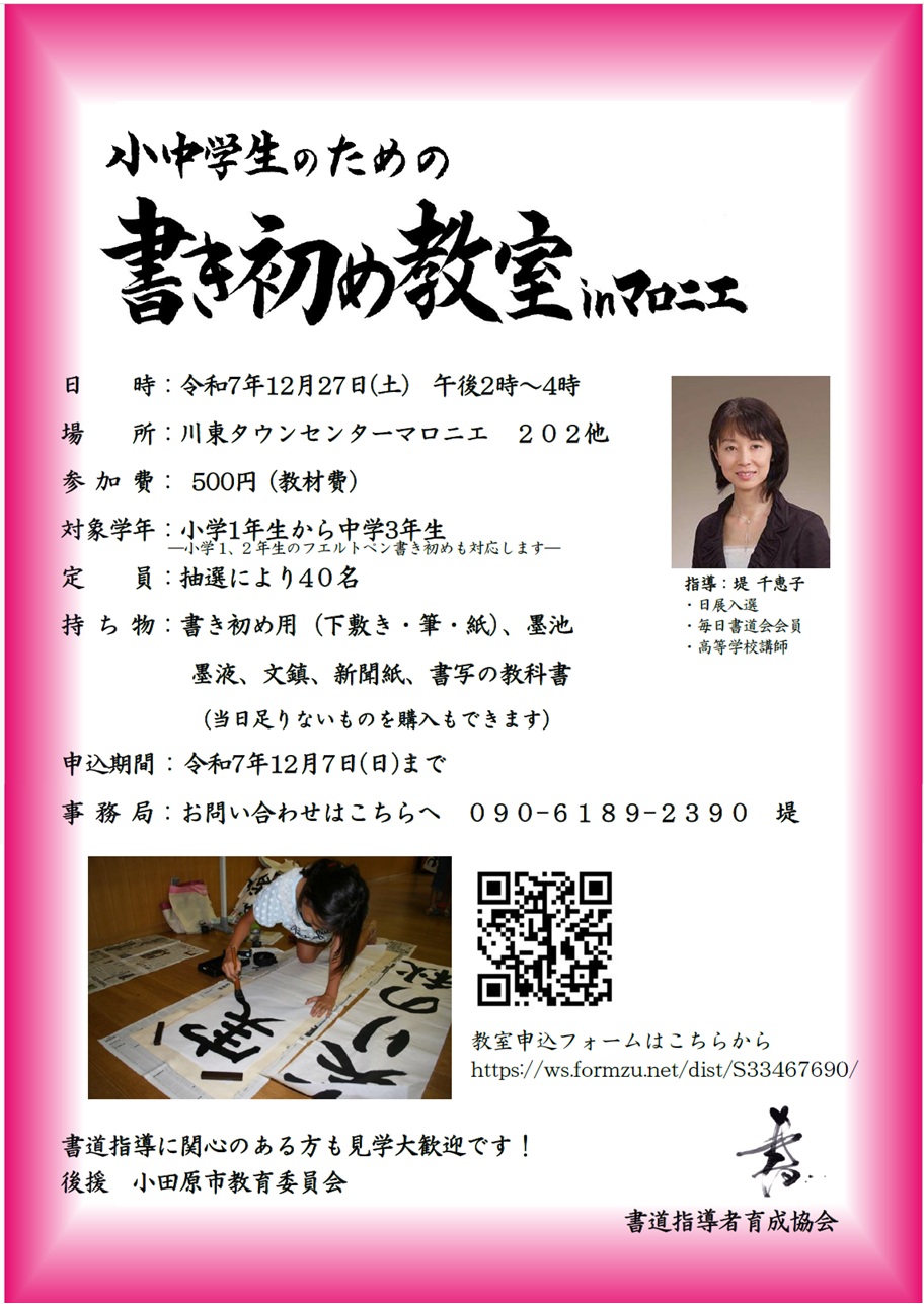 小中学生のための書き初め教室inマロニエ 🌸参加者募集 小中学生のための書き初め教室inマロニエ 令和7年12月27日(土)午後2時〜4時 川東タウンセンターマロニエ 202他 小学1、2年生はフェルトペンでの書き初めです 冬休みの学校の宿題をやってみよう 書道文化をユネスコ無形文化遺産に❗️ 書き初め文化を大切にしよう‼️ 申し込みフォーム https://ws.formzu.net/sfgen/S33467690/ 🌸書道指導ボランティアも同時募集 書道指導の他、道具の扱いやお子さんに寄り添っていただける方